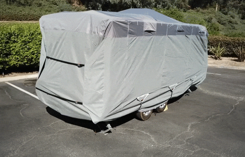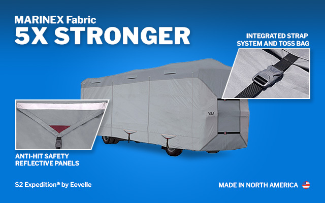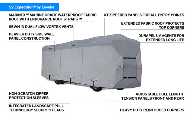 The S2 Expedition is the next generation of RV covers that combines technical enhancements with sleek, cutting edge design. This superior cover is loaded with many desirable features, including a woven marine grade fabric roof, large EZ fit flags on front and rear, quick release web strap system for easy installation, and heavy duty full height access zippers all the way around the cover.